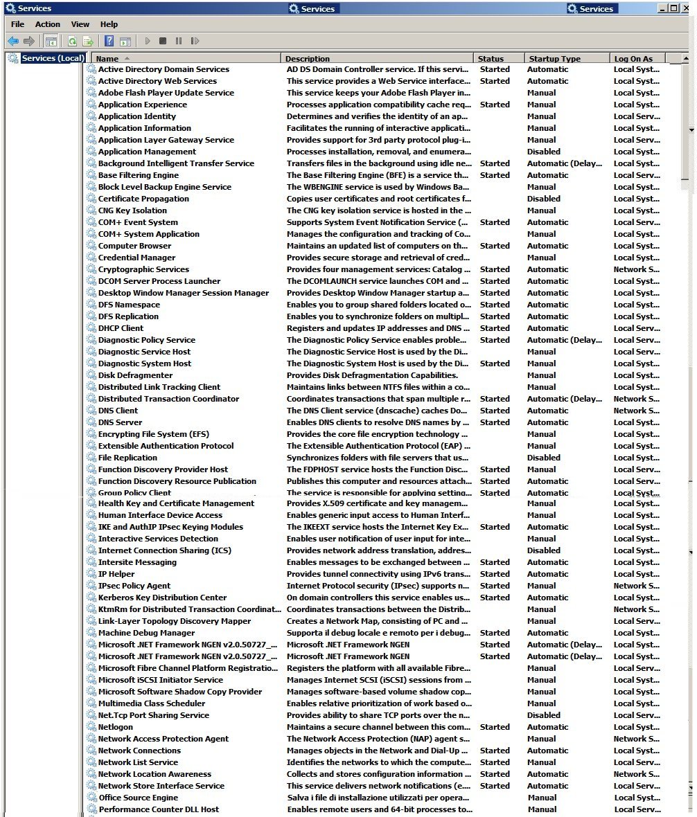 01– Dopo aver completato l’installazione Windows Server 2008 R2, inserire una password complessa con almeno una lettera maiuscola, una minuscola e un numero. 02 – Abbassare il livello di User Account control cliccando su Change User Account Control settings. 03 – Attivare il Windows 2008 Server R2. 04 – Assegnare un nome al computer es. Server e Gruppo di lavoro es. Dominio 05 –Utilizzare due schede di rete (Esterna, Virtuale) ed impostare ad esempio con i seguenti parametri: Prima scheda IP:192.168.0.100 – SUBNET: 255.255.255.0 – Gatway: 192.168.0.1 – DNS: 127.0.0.1 Nominare Rete Esterna (Sostituire Rete Pubblica con la Rete Aziendale) Seconda scheda IP:192.168.100.1 – SUBNET: 255.255.255.0 – Gatway: Vuoto – DNS: 127.0.0.1 Nominare Rete Virtuale Network Connection --> Advanced (per attivare premere Alt) --> Advanced Setting --> verificare che la Rete Esterna sia principale. 08 – Digitare DCPROMO (Start/Run/…) per creare un Dominio con un’estensione. (es. Dominio.Local). http://technet.microsoft.com/it-it/library/cc825616.aspx 07 – Per performare Active Directory, Eseguire Adprep digitando dal prompt dei comandi Adprep, Adprep /Forestprep, Adprep /Domainprep, Adprep /Rodcprep. Per 32Bit Adprep32. (il file si trova nel DVD Windows 2008 R2 sotto \Support\Adprep) 08 – Dopo avere creato il Dominio, disattivare complessità e limitazione della password in seguente modo: (Group Policy…..Configuration\Windows Settings\Security Settings\Account Policies\Password Policys). Administrative Tools \ Group Policy Management \ Forest: Dominio\ Domains \ Dominio \ tasto dx su Default Domain Policy \ Edit: si apre Group Policy Management Editor \ Computer Configuration \ Policies \ Windows Settings \ Security Settings \ Account Policy \ Password Policy \ Password must meet Complexy Requirements: Disable ed impostare anche "Maximum password age" da 42 a 0. 09 – Gestione servizi DNS:Server Manager --> DNS Server à Server --> Riverse Looking Zone --> New Zone --> Next --> Next -- ….. ed assegnare gli indirizzi alle schede. La prima: 192.168.0 e per la seconda: 192.168.100. 10 – Agiornare il record DNS. Server Manager --> DNS Server -->Server --> Dominio.local Selezionare le due schede Server-Host(A) -192.168.0.100. e 192.168.100.1 ed Attivare PTR. 11 – Server Manager --> DNS Server --> Server --> Proprietà Deselezionare IPv6 e successivamente cliccare su Forwardes e assegnare DNS1 e DNS2 del provider in uso ad esempio: DNS1- 193.70.192.100 e DNS2 - 195.210.91.100 12 – Server Manager --> View --> Lunch nslookup Se le configurazioni sono corretti, viene visualizzato: Default server: server.dominio.local Address: 192.168.0.100 Per eventuale problemi Lanciare ipconfig /all - ipconfig /flushdns - ipconfig /registerdns 13 – Verificare che siano attivi ed impostati su Automatic i seguenti servizi (Start/Run/Services.Msc): - Computer Browser - DNS Client - Function Discovery Resorce Publication - Network Connections - Remote Access Connection Manager - SSDP Discovery - TCP/IP NetBIOS Helper - UPnP Device Host 14 – Mapping di Rete. Per attivare/disattivare:
